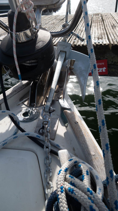 Das Bild täuscht, ich fahre den Anker unterwegs nie auf der Bugrolle sondern im Kettenkasten.