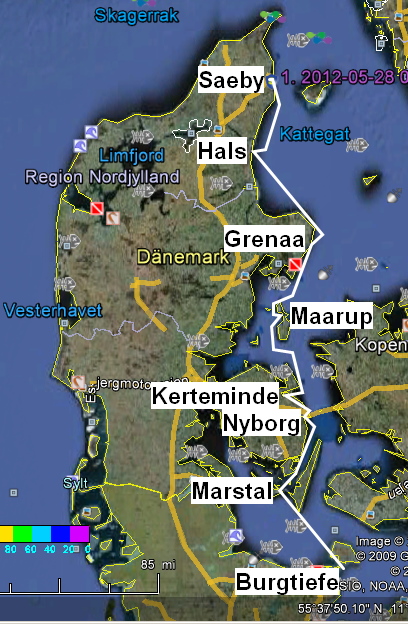 m Freitag nach Himmelfahrt startete ich meinen diesjährigen Törn von Burgtiefe nach Marstal auf Ärö in Dänemark. Es war nach vielen kalten Tage und viel Wind der erste Tag mit annehmbaren Temperaturen und auf der Strecke in guter SE-Wind, mit dem ich die ganzen 40 Seemeilen segeln konnte, ein guter Auftakt. Aber danach konnte ich keine Strecke mehr komplett segeln. Nach Nyborg an der Brücke über den Großen Belt, nur noch zur Hälfte, nach Kerteminde motort, von dort nach Maarup auf Samsö zur Hälfte gegenan gesegelt, dann nach Grenaa, Hals und Saeby alle motort. Zwischendurch ein paar Hafentage, weil der ständige Nordost mir zu unbequem war.