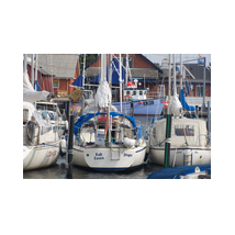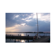 Von Hals nach Grenaa sind direkt 43 sm. Ich konnte sehr gut bei NE 4-6 zeitweise gerefft segeln. Kurz vor Grenaa, schon nahe der Küste, erwischte mich ein Unwetter. Ich schaffte es noch mich wasserdicht zu verpacken, die Fock ein zu rollen, den Motor zu starten (denn ich wollte eigentlich auch erstmal das Groß bergen) und dann war das Unwetter auch schon da. Das Groß stand noch mit 2 Reffs. Der NE Wind ging, wie ich später erfuhr, auf Bft. 8 herauf und war natürlich auflandig. Ich hatte mir aber schon vorher etwas Luvraum, also Abstand zur Küste geholt. Die Sicht ging quasi gegen 0, der starke Regen flog mir waagerecht ins Gesicht. Durch die nasse Brille konnte ich weder den Kompass noch das GPS Gerät gut ablesen. Aber der kleine Kartenplotter mit seiner starken Hintergrundbeleuchtung zeigt mir an, daß Kurs und Geschwingkeit reichten, um sich von der Küste frei zu segeln. Der Motor lief nur im Leerlauf ohne Gang. Nach einer halben Stunde war das Ärgste vorbei, die Sicht wurde wieder besser, aber der Wind blieb fast genau so kräftig. Da ich bei dem inzwischen starken Seegang nicht das Groß ganz bergen wollte, beschloss ich damit in den Hafen zu segeln, denn ich wußte, da ist genug Platz für Manöver. Platt vor dem Laken mit dem 2 fach gerefften Groß segelte ich mit 7 kn auf die Molenköpfe zu. In der Einfahrt stand eine Grundsee, die das Boot kurz auf 9 kn ins surfen brachte. Dann war Ruhe, jedenfalls was die Wellen betraf, der Wind war auch im Hafen nicht gerade schwach.